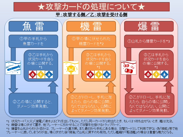 (攻撃を受けても、手札から一枚も状況カードが出せない場合は一撃で沈没!)