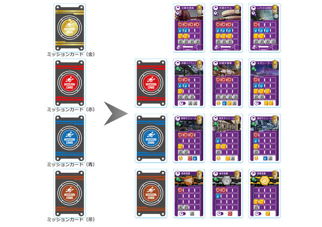 6.ミッションカードの背面を参照し、金、赤、青、茶の色別に分け、山札とします。
