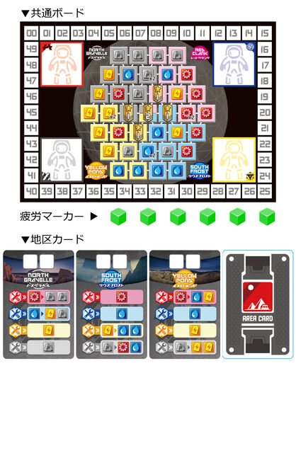 ※プレイヤーボードに示された4つの資源は資源マーカーで数を管理します(各資源の上限は4個まで)。▼で示された数が、そのボードの初期資源となります。