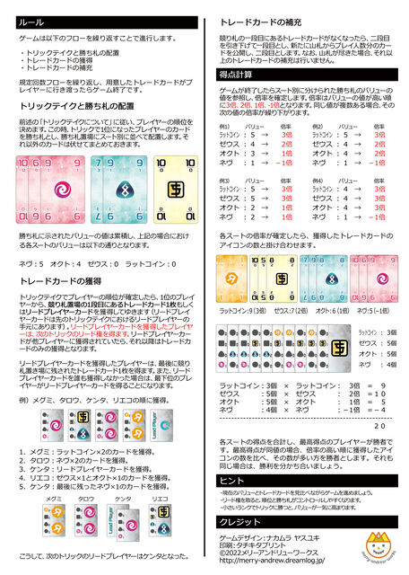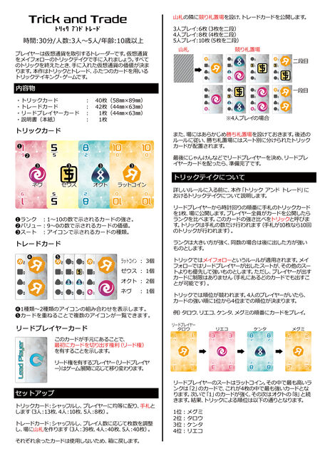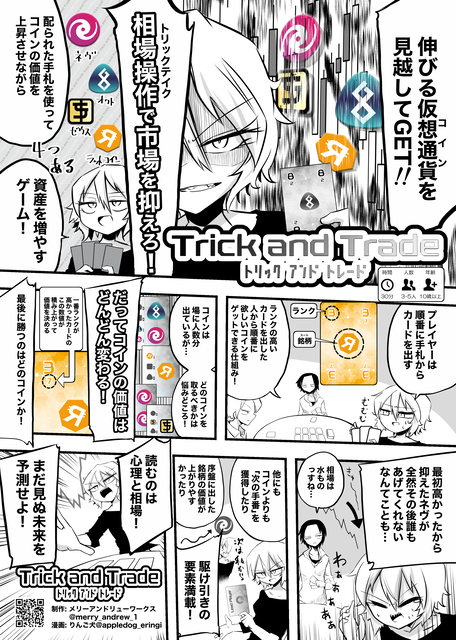 プレイヤーは仮想通貨を取引するトレーダー。価値が変動する仮想通貨をメイフォローのトリックテイクで手に入れましょう。すべてのトリックを終えたとき、仮想通貨の価値が決まります。メイフォローのトリテと、競りの要素を「トリックカード」と「トレードカード」の二種類のカードで表現。先見の明が試されるカードゲームです。